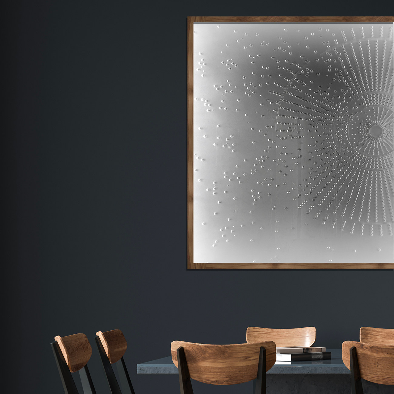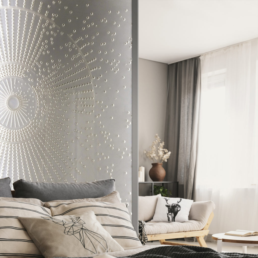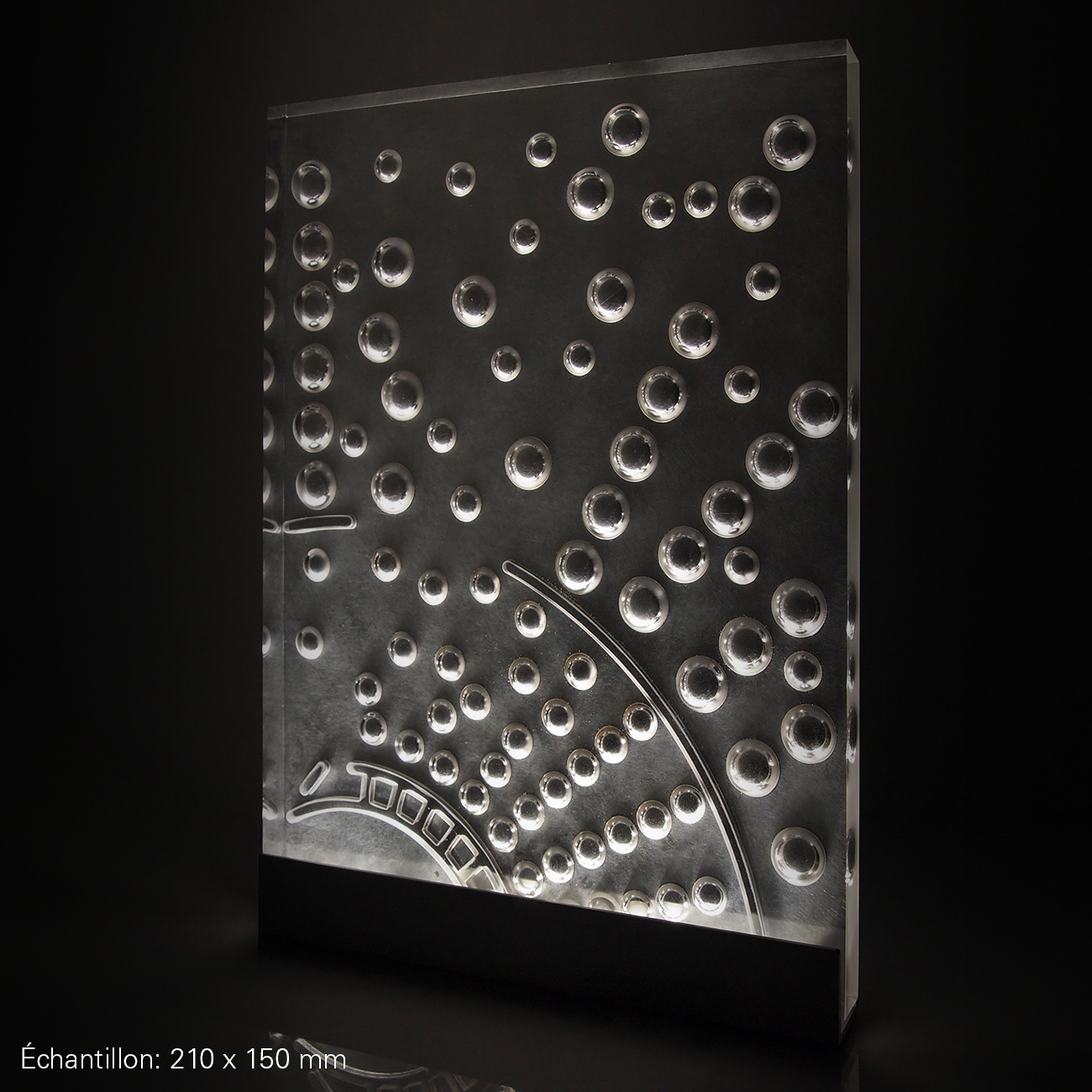 Un mélange audacieux de gravure numérique, suivant un fichier, une reprise de tous les détails à la main, un mélange d’effets polis et dépolis. La matière Dacryl sert de support a une création que nous adaptons aux souhaits des architectes.
